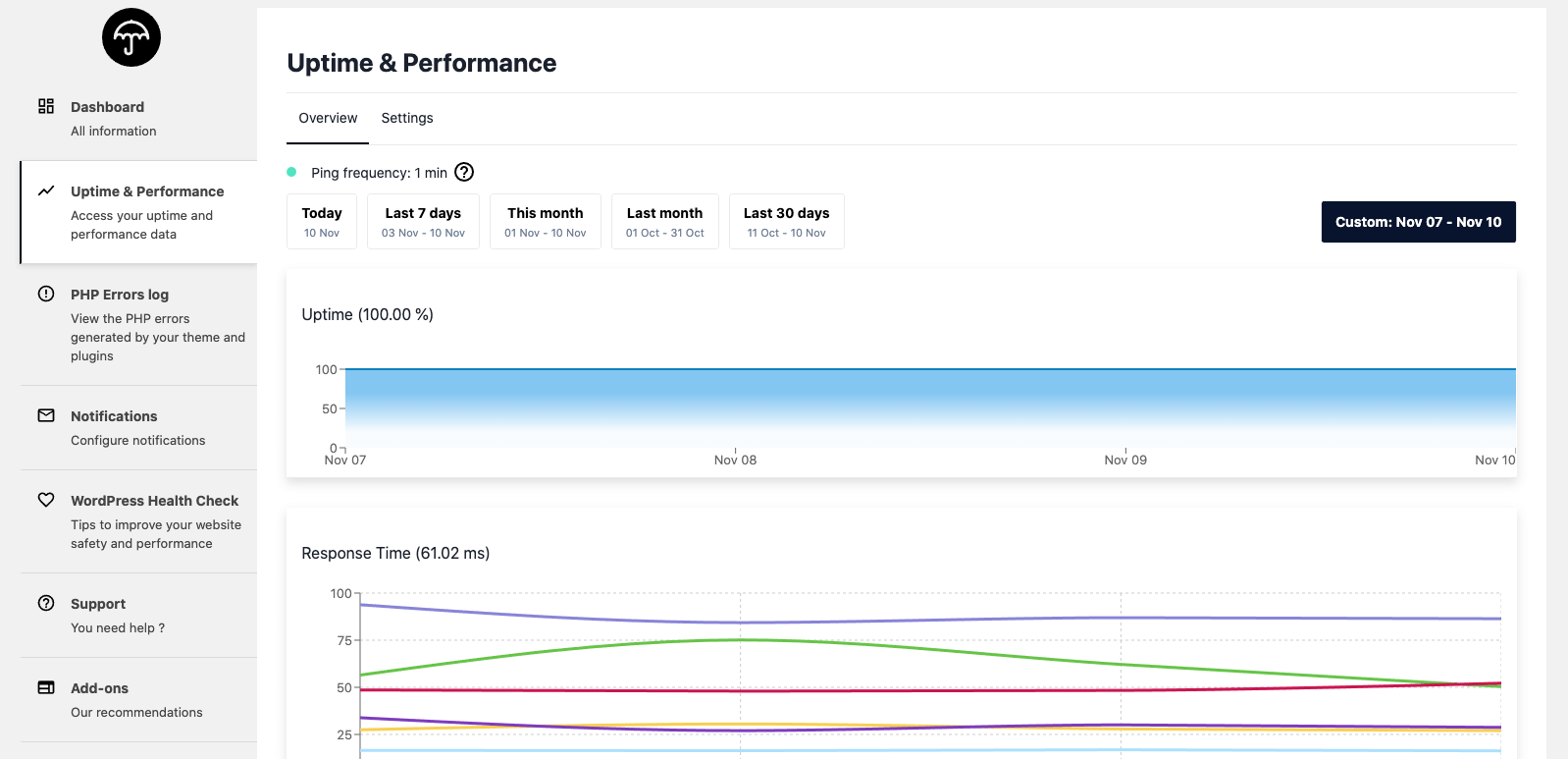 WP Umbrella is a comprehensive monitoring plugin for WordPress. It constantly checks website uptime and performance and alerts you if something goes wrong (downtime or traffic spike).